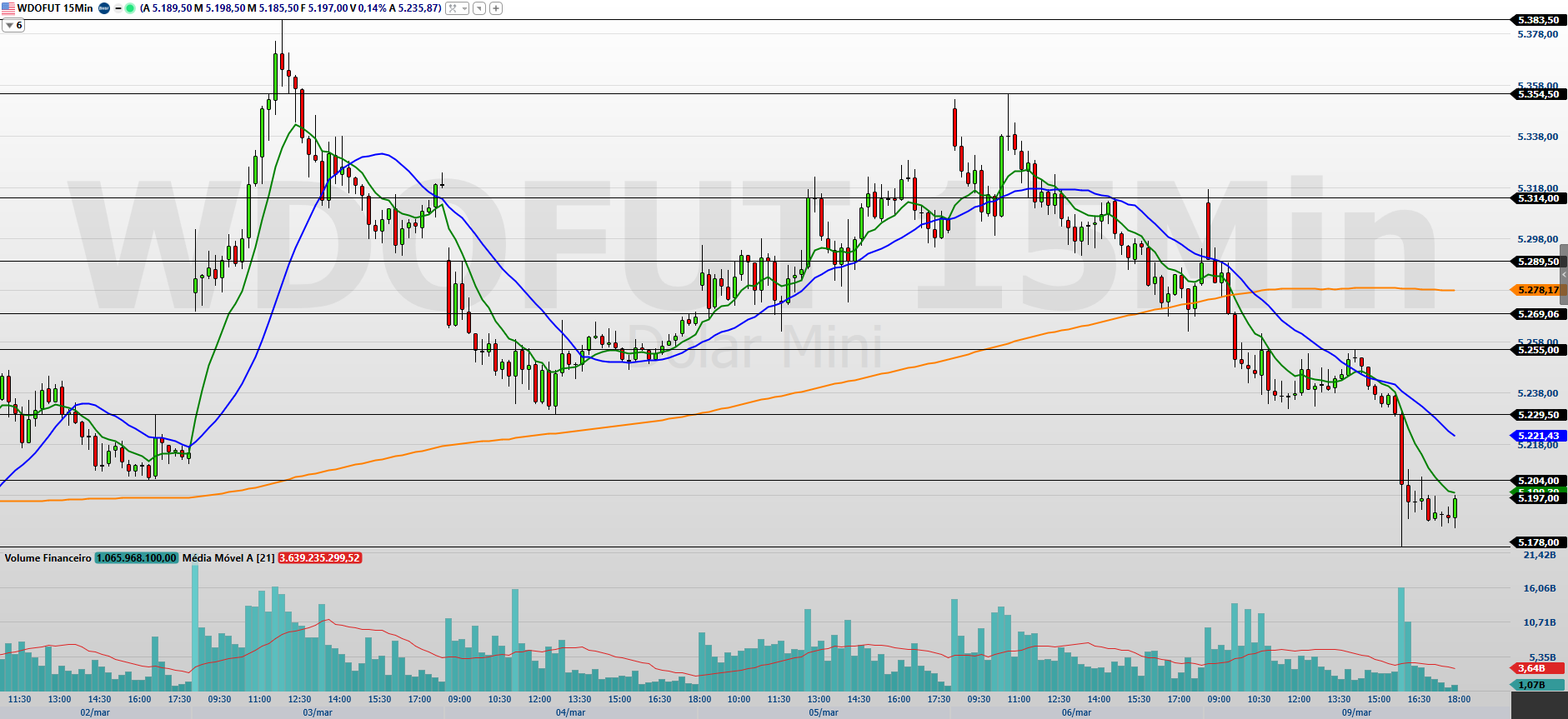 No gráfico de 15 minutos, observo que o minidólar encerrou a última sessão com forte baixa, mantendo o fluxo vendedor dominante. O preço terminou o pregão abaixo das médias móveis de 9 e 21 períodos, o que reforça o enfraquecimento do momentum comprador no curtíssimo prazo.