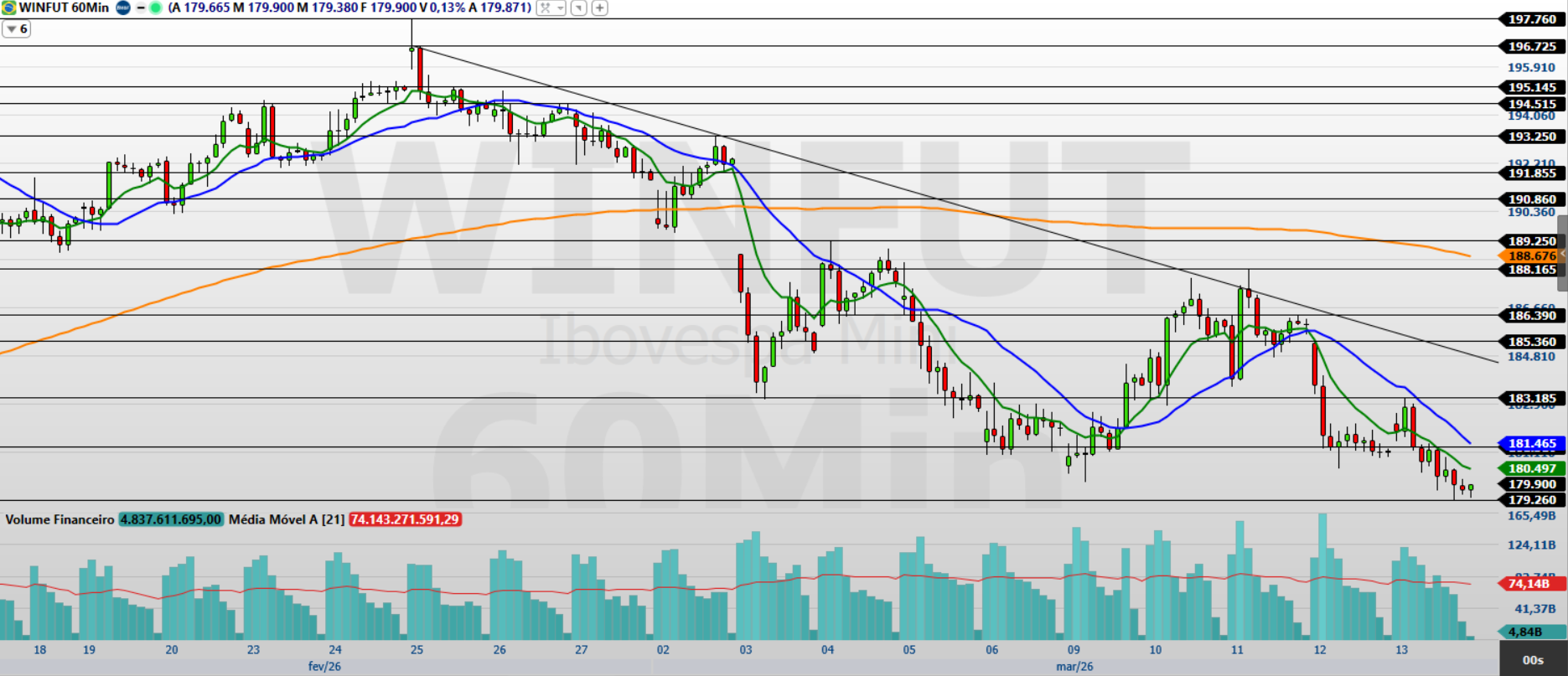 O mini-índice (WINJ26), com vencimento em abril, encerrou a última sessão (13/03) em queda de 0,72%, aos 179.900 pontos, mantendo o fluxo vendedor no curto prazo. O Ibovespa recuou 0,91%, aos 178.653 pontos, ampliando a cautela nos mercados e registrando a terceira semana seguida de perdas. O movimento acompanhou o cenário externo negativo, com Wall Street em queda em meio às incertezas da guerra no Oriente Médio e ao petróleo novamente acima de US$ 100. No Brasil, o dólar subiu para a região de R$ 5,31 e os juros futuros avançaram ao longo da curva.