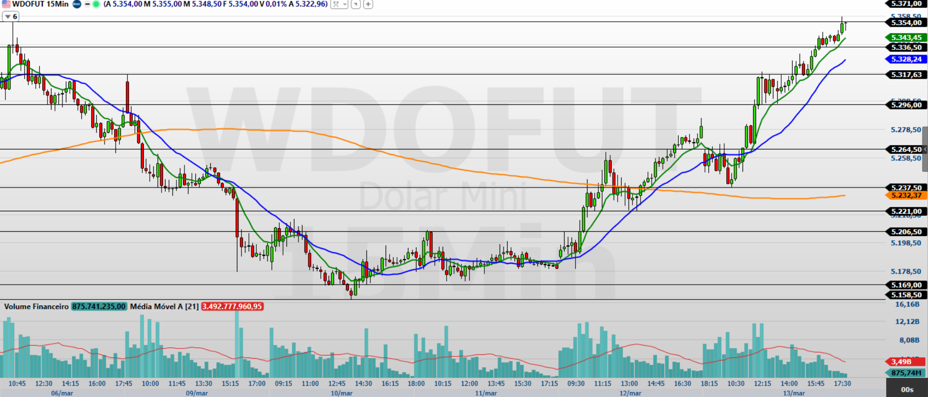 No gráfico de 15 minutos, observo que o minidólar encerrou a última sessão em alta, dando sequência ao movimento de recuperação iniciado anteriormente. O preço terminou o pregão acima das médias móveis de 9 e 21 períodos, o que reforça a presença de fluxo comprador no curtíssimo prazo.