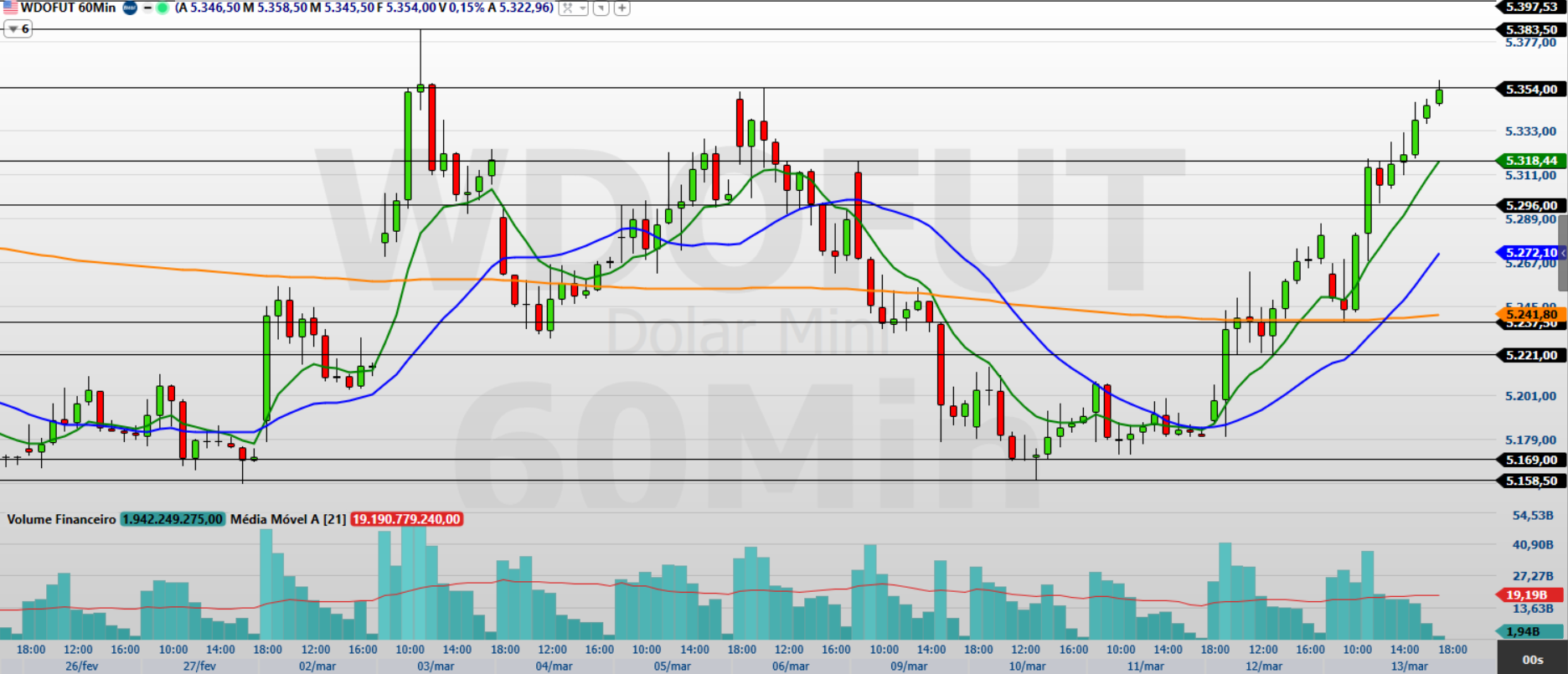 No gráfico de 60 minutos, o minidólar encerrou a sessão em alta e permanece acima das médias móveis de 9 e 21 períodos, confirmando a melhora do momentum comprador.
