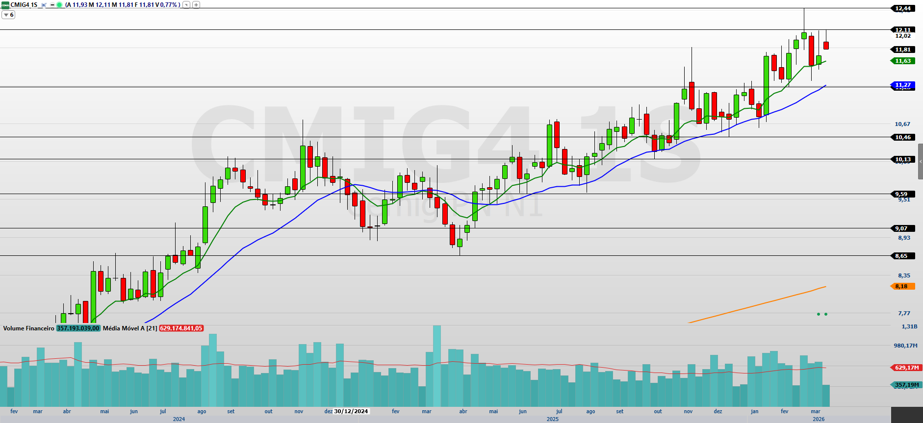 No gráfico semanal, a Cemig (CMIG4) mantém tendência de alta no médio prazo, acumulando valorização de aproximadamente 5,45% em 2026 e sendo negociada próxima de R$ 11,81. Após renovar a máxima recente em R$ 12,44, o ativo passou a apresentar movimento corretivo, embora ainda permaneça acima das médias móveis de 9 e 21 períodos, o que mantém a estrutura altista preservada.