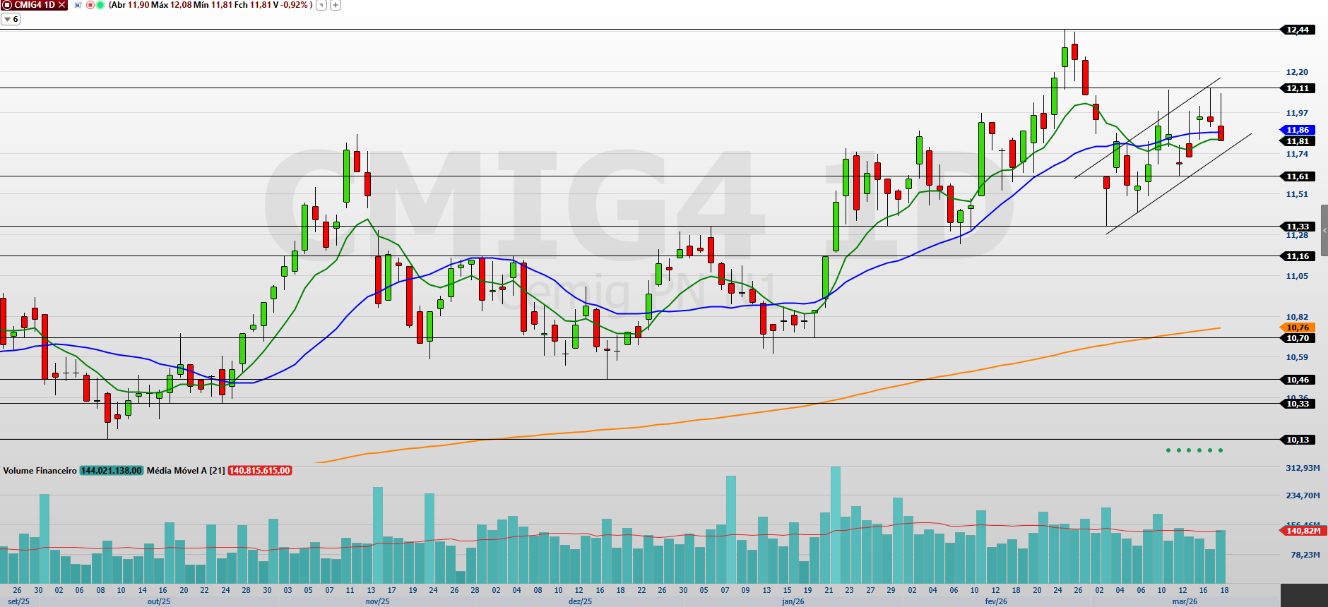 No curto prazo, observo que a Cemig (CMIG4) apresenta movimento corretivo, após o forte fluxo comprador que levou o papel a renovar a máxima histórica em R$ 12,44. Atualmente negociado próximo de R$ 11,81, o ativo encerrou a última sessão em queda de 0,92% e passou a trabalhar ligeiramente abaixo das médias móveis de 9 e 21 períodos, embora ainda muito próximo delas.