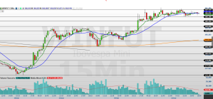 No gráfico de 15 minutos, observo que o mini-índice mantém movimento positivo, negociando acima das médias de 9 e 21 períodos, o que reforça o viés altista no curtíssimo prazo.